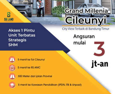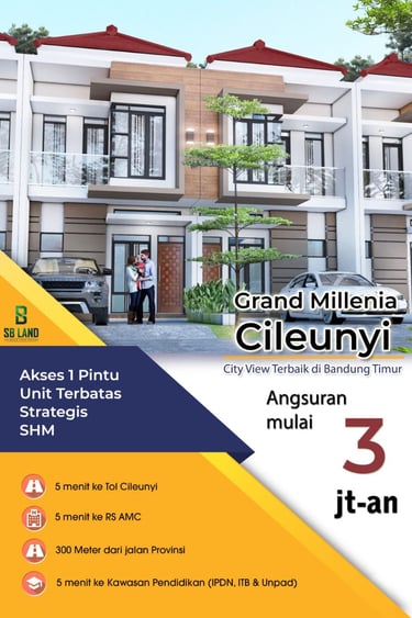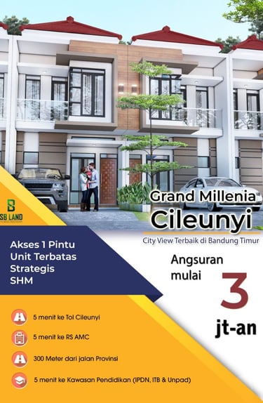 Dijual sebuah rumah perumahan Grand Millenia Cileunyi, Bandung Timur. Salah satu kawasan favorit hunian bagi kaum millenial karena dekat dengan akses tol, fasilitas publik, dan kawasan pendidikan Jatinangor. Sangat cocok sebagai hunian atau investasi jangka panjang karena pangsa pasar yang cukup luas dan kawasan ini dikenal juga sebagai segitiga emas Bandung Timur.