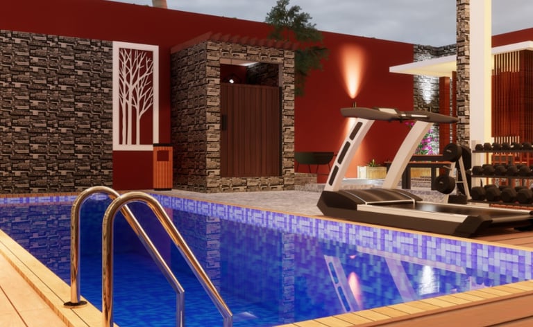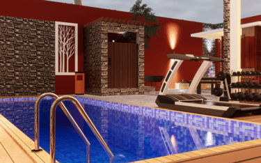 Parking Lot, kolam renang, gym, musholla, ruang belajar, ruang tamu, ruang keluarga, dan service area & gudang.